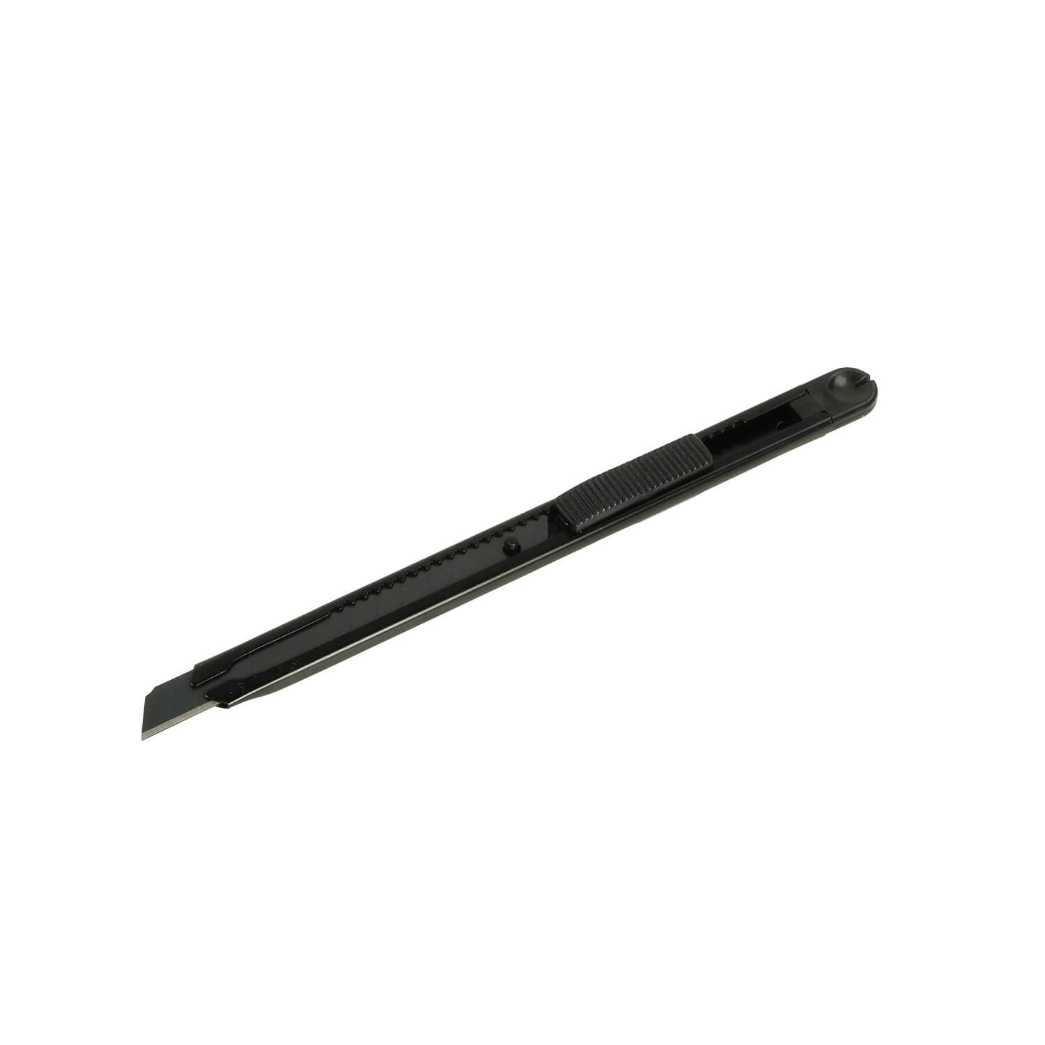 Schwarzes Messer im Metallgehäuse in Form eines Stiftes mit stabilem Klip.